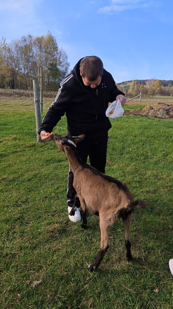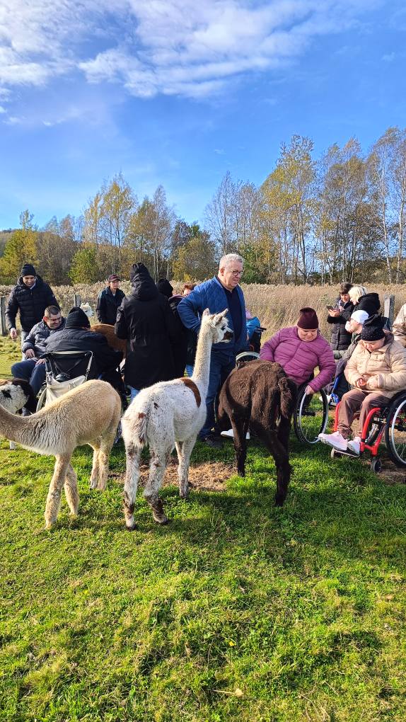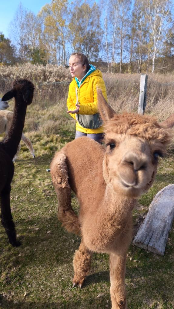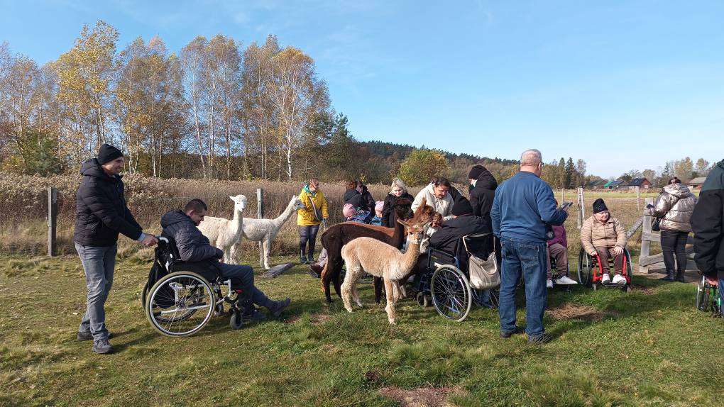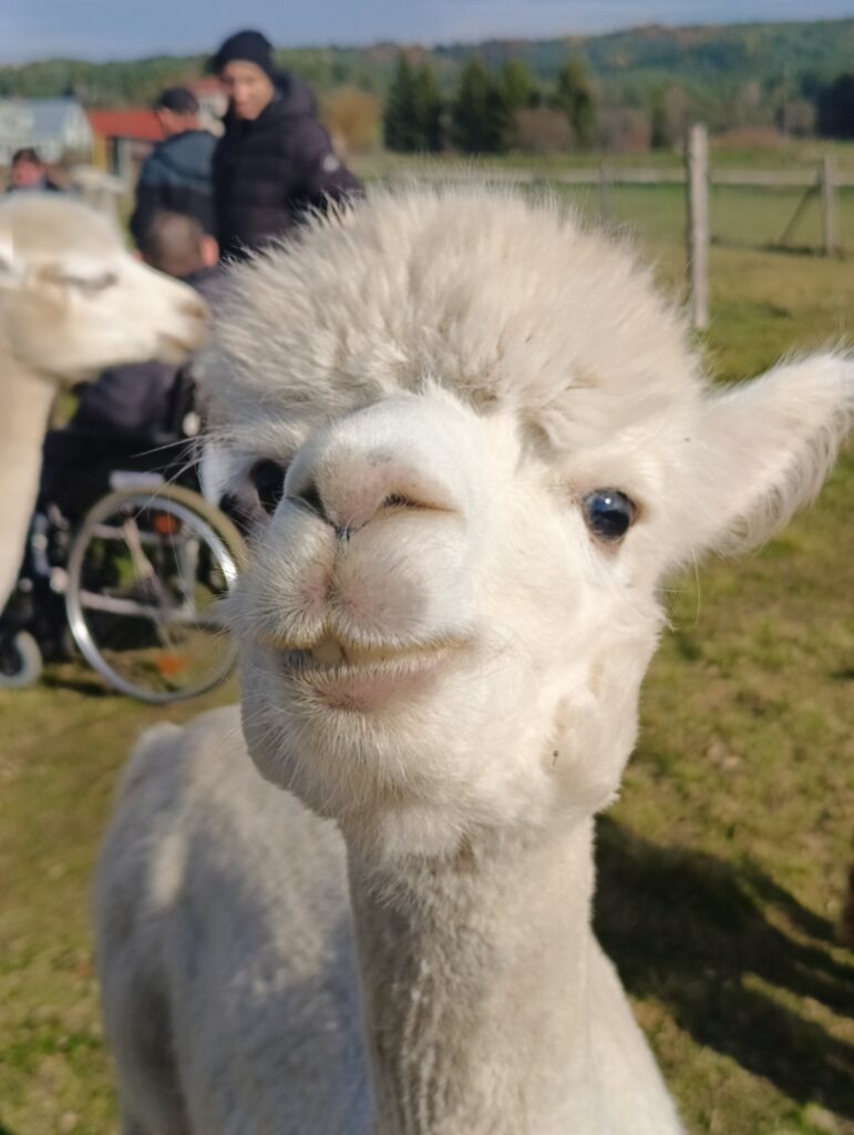 Przywitała nas piękna słoneczna pogoda, którą odczytaliśmy jako serdeczne zaproszenie. W zagrodzie mieszkają alpaki oraz kozy, które nauczone są kontaktów z ludźmi i jak się okazało są bardzo sympatyczne. Zwierzaki mają nadane imiona. Wśród kóz była m.in Lucyna, Malinka, Stefan, Henio Jerzy. Alpaki z kolei to Tekla, Madzia, Irena, malutki Ferdynand. Każdy z nas otrzymał torebkę z marchewką oraz krótki instruktaż w jaki sposób karmić zwierzęta.